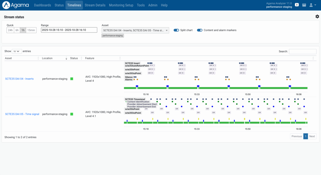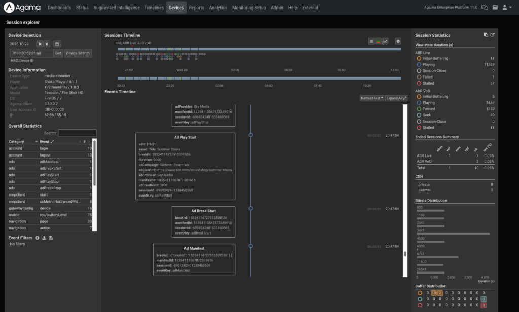 Agama combines network-side analysis with device signals to give a full view of CSAI ad delivery. Analyzer OTT monitors the OTT streams at the headend, origin, or CDN, next stream quality and availability, while also tracking SCTE-35 ad markers and break windows. This reveals how many ad opportunities exist in each stream and whether signaling is consistent across formats like DASH and HLS.