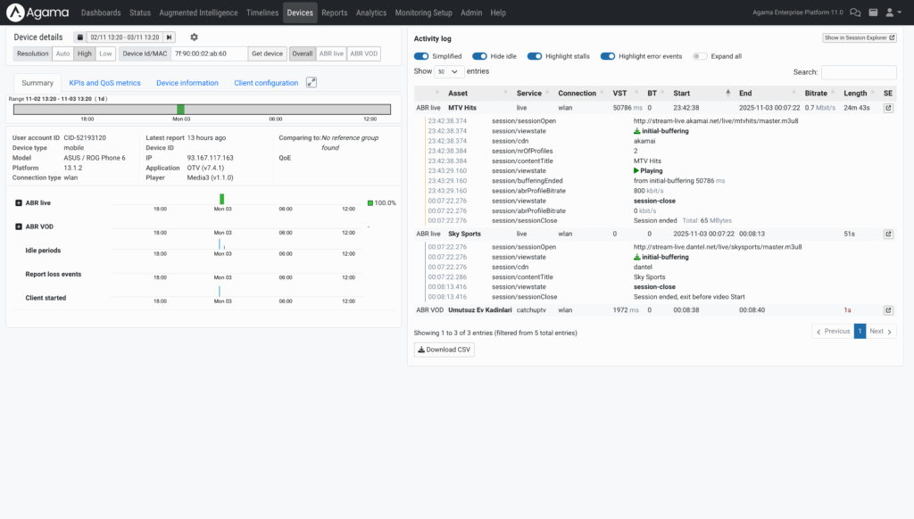 If the dashboard shows a drop in impressions or viewing hours, device view helps you determine whether the issue reached user. It shows if the device encountered buffering during the content leading into or out of an ad break, providing context that isn’t visible from the stream alone.