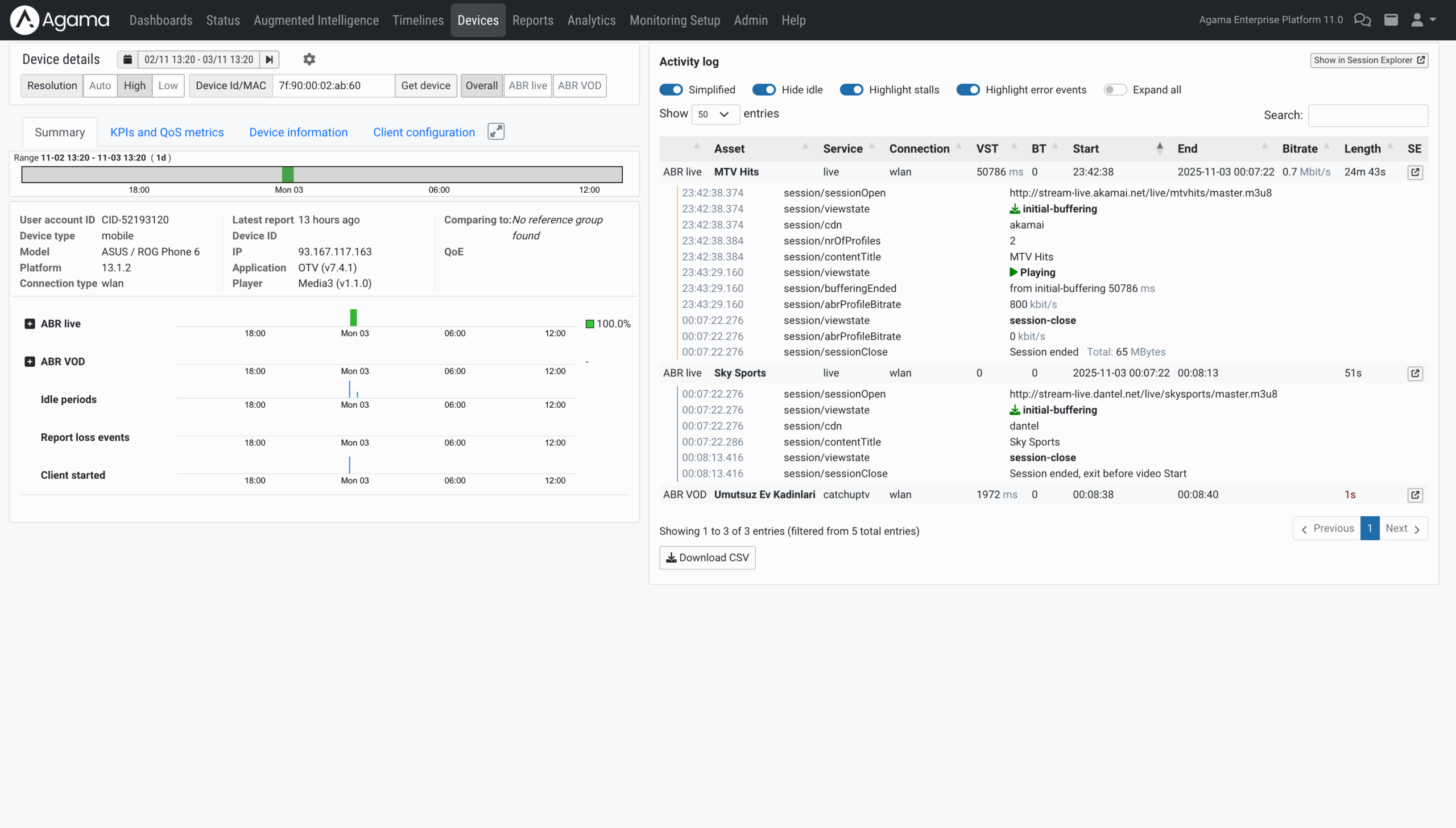 The device view shows how each channel or asset was experienced by the viewer. It highlights stalls, startup delays, bitrate shifts, and any playback instability that could impact ad viewing or cause session abandonment.