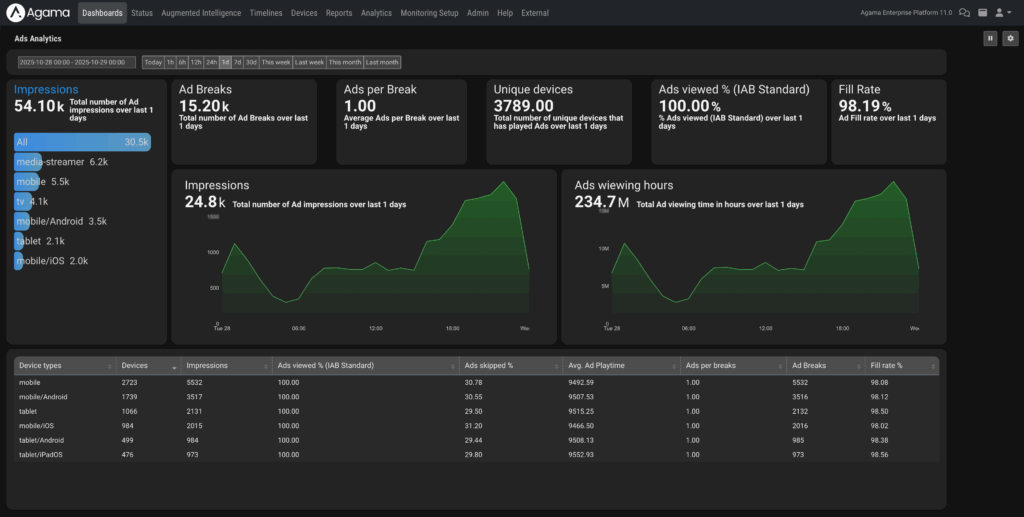 The Ads Dashboard aggregates delivery and playback performance across devices and platforms. It tracks impressions, ad breaks, fill rate, and completion ratios according to IAB standards.