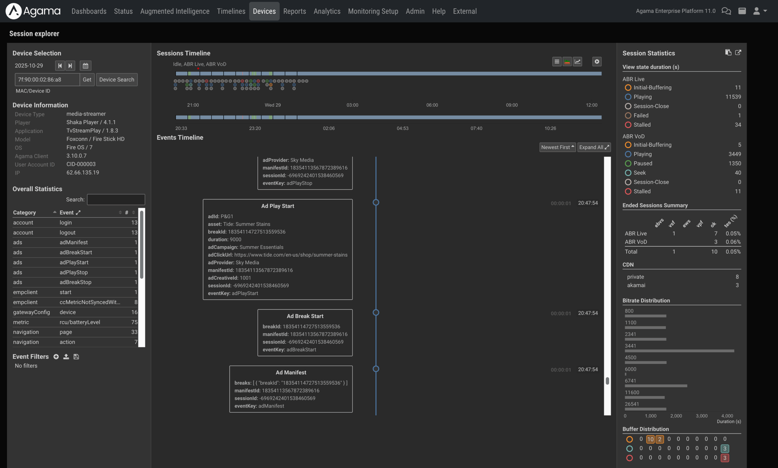 The Session Explorer exposes every ad-related event inside a playback session. It shows transitions into the ad manifest, adBreakStart, adPlayStart, and adBreakStop, together with metadata such as creative ID, campaign, and durations.