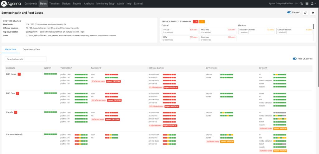 See the entire delivery chain in one view – from ingest and transcode, through packaging and CDNs, to the end-user devices. When an issue occurs, the system not only shows where it originated but also how many viewers are affected and suggested actions.